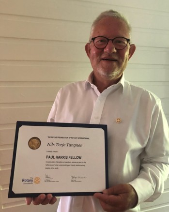 Nils Terje Tangnes med en Paul Harris Fellow Recognition.
