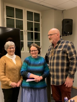 Anne Marie presenterte Anne-Torin Wandt Lynne. Hun har vært en ivrig gjest på møtene over en tid. En dame med en brei fagutdannelse og praksis som Anne Marie mente ville passe godt som medlem i klubben vår. President Charles leste fra Håndboka og festet Rotarynåla på Anne-Torin.