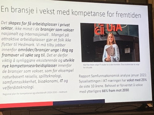 Detter er Innlandets olje! NTNU står i sentrum, men det etableres bedrifter også rundt hele Mjøsa. Gunn Marie viste hvor ille det kan gå med dårlig sikkerhet. Østre Toten kommune er et grelt eksempel på hvordan det kan gå. Det er for få studieplasser på dette feltet. De som har utdanning i dette faget, er sikret gode jobber framover.