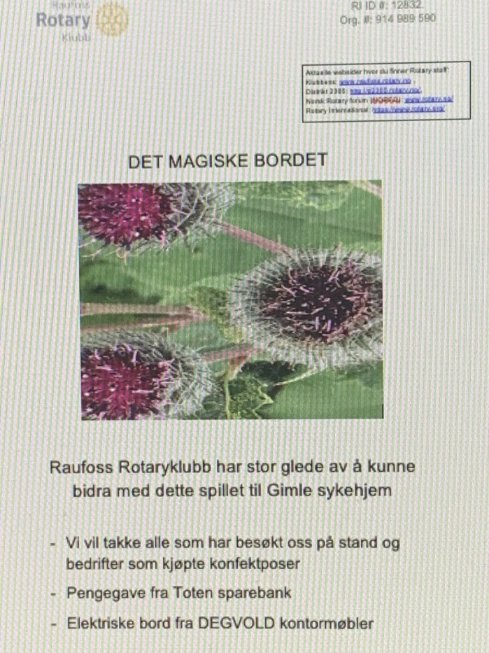 Vi har solgt konfektposer til bedrifter, og fra våre Rotarystands til lokalbefolkningen, samtidig med at vi har fått informert om klubbens formål og aktiviteter. Med hjelp fra vår lokale bank og en utstyrsleverandør er vi i mål med det interaktive spillet Tovertafel. Spillet er nå installert i en av stuene på Gimle sykehjem og skal brukes av beboere og dagbesøkende.
