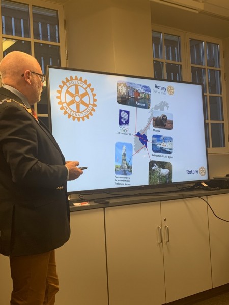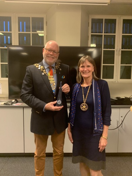 Ordet ble så overlatt til distriktsguvernøren, nå i år fra Eda Rotaryklubb i Sverige og assisterende guvernør fra Lillehammer. Begge presenterte seg – og Anders Andersson holdt kveldens foredrag om Rotarys oppgaver og utfordringer. Vi er en serviceinstitusjon og han la vekt på våre kjernesaker. Guvernøren roste vår innsats i klubben, noe som gir oss motivasjon til fortsatt å følge Rotarys formål som er: «Å utvikle vennskap som grunnlag for å gagne andre.»