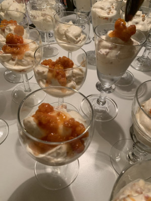 På menyen sto rakfisk med godt tilbehør og godt drikke, og moltekrem til dessert. Praten gikk livlig og vi gjennomførte sangene, og nøt herrene Furuseth og Napstads muntre viser.