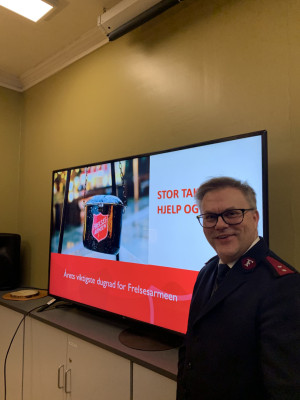Han viste en fyldig presentasjon av Frelsesarmeen – om organisasjonen som sådan og alle arbeidsfelt i bl.a. nærmiljøkirker i lokalsamfunn og hele hjelpeapparatet. Ett av målene er å bygge mental helse.