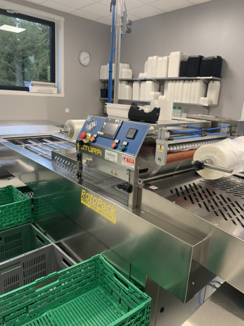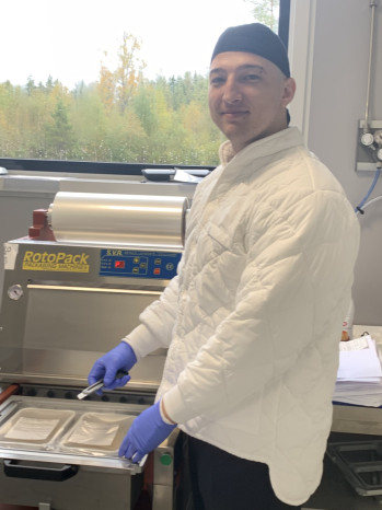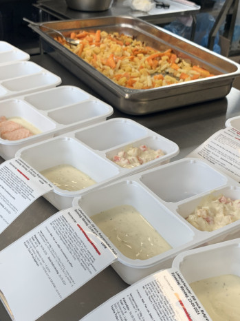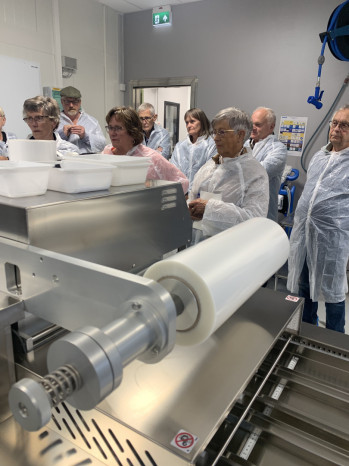 Etter omvisningen, ble vi traktert med kaffe og kringle, parallelt med mange spørsmål som Brit svarte velvillig på. Alle hensyn er tatt når det gjelder individuelle tilpasninger som næringstetthet, allergier og variasjon av mattilbudet, – og ikke minst veklegging av renhold, holdbarhetsprøver og matavfall/kompostering. Godt samarbeid med Mjøslabatoriet på Gjøvik gjør at produsjonen skal være  betryggende.