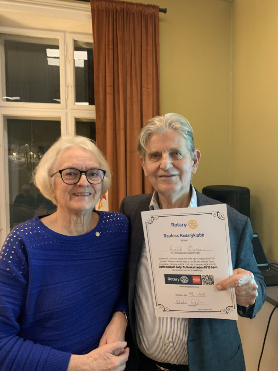 Kirsten takket Arild Øyen for et lærerikt og interessant foredrag, og han fikk tildelt Rotarys diplom – til inntekt for poliovaksinasjon.