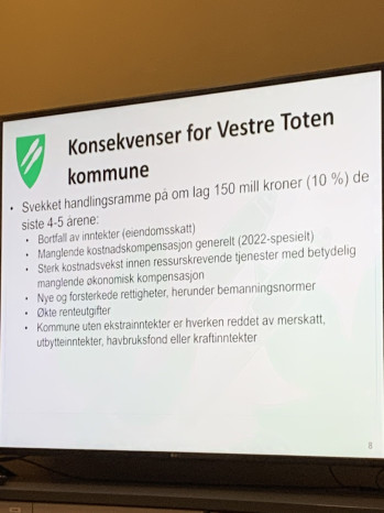 Hele kommunesektoren går med store underskudd i Norge, en ny situasjon i forhold til tidligere. Vestre Toten er heldige med investeringer som allerede er gjort, f.eks. ny ungdomsskole. 80% av norske kommuner går med underskudd.