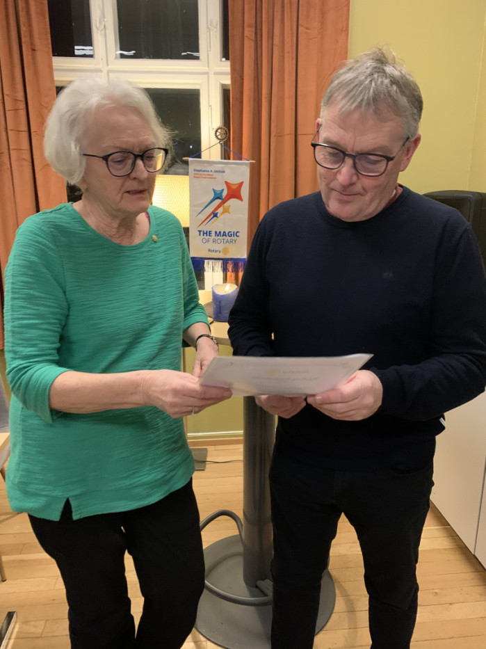 President Kirsten ønsket velkommen til kveldens møte: Rotarianere og foredragsholder, kommunedirektør Bjørn Fauchald.