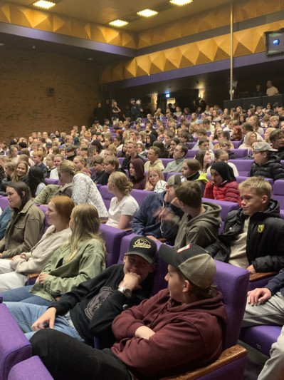 En fullsatt kinosal med godt over 400 elever satt som tente lys og hørte på.